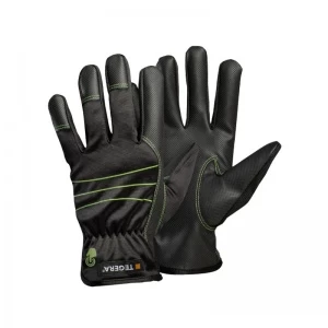 Ejendals 520 Gloves are black all over with green trim and decals donning the fingertips, thumb crotch and the back of the hand. They are a slender, medium-weight glove with a reinforced index finger and fingertips.Ā