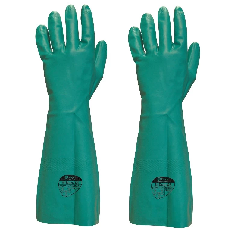 Polyco N-Dura 45 Chemical Resistant Gloves ND45 come complete with an incredible 45cm extended cuff to protect the hands, wrists and forearms from contact with dangerous chemicals and solvents. Their maximum level 4 abrasion resistance rating and extensive chemical protection under EN 374, they shield the user against corrosion and burning when working with volatile and dangerous substances and liquids.