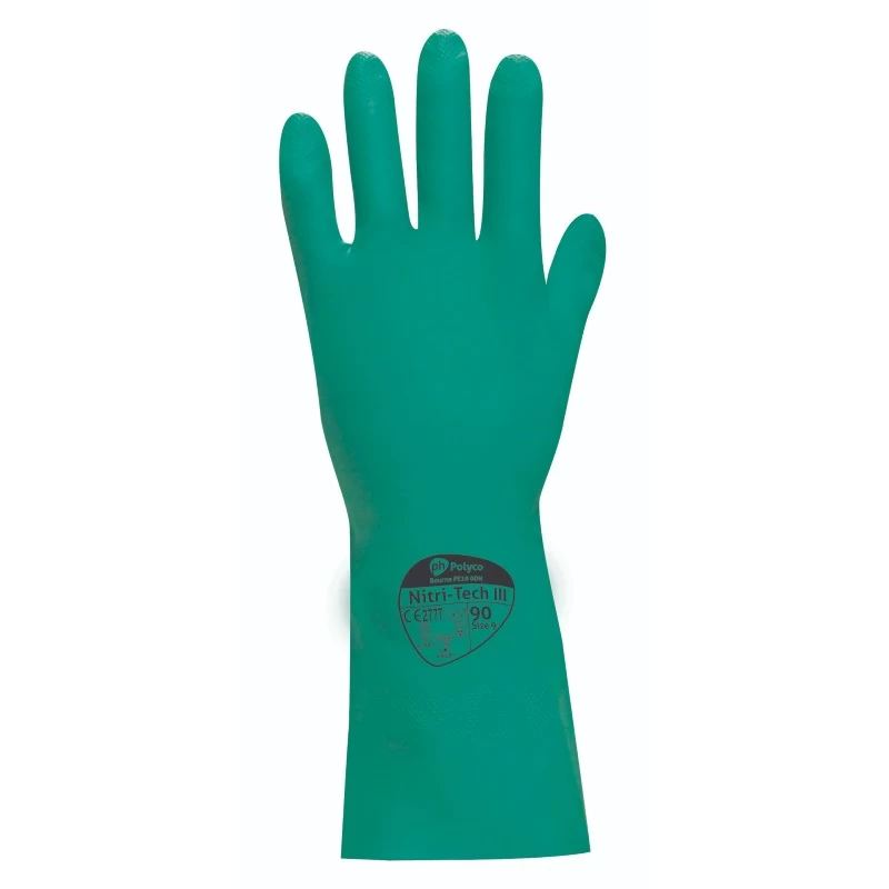 Polyco Nitri-Tech III Chemical Resistant Gloves are chemical resistant safety gloves that offer protection from a wide range of chemicals including strong detergents, oils and certain solvents. Ideal for use when handling chemicals and undertaking industrial cleaning applications, Polyco Nitri-Tech Gloves protect the hand, wrist and forearm from splashing and exposure to chemicals.