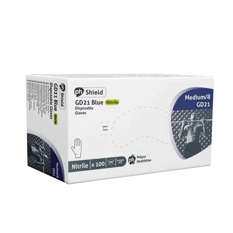 The Shield GD21 Blue Powder-Free Nitrile Disposable Gloves are high quality disposable gloves designed to provide tough and reliable hand protection without compromising dexterity or user comfort. Manufactured from nitrile, these gloves are completely latex free, which makes them suitable for users with latex allergy and those with hypersensitive skin.