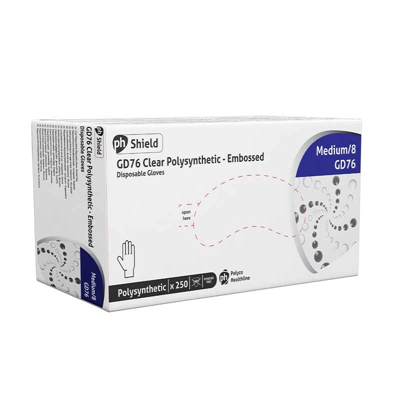 The Shield GD76 Clear Powder-Free Polysynthetic Gloves are made from a blend of polythene and synthetic polymers and have been engineered to provide increased performance over polyethylene gloves. Latex free, these polysynthetic gloves are ideal for individuals with hypersensitive skin or a pre-existing latex allergy.