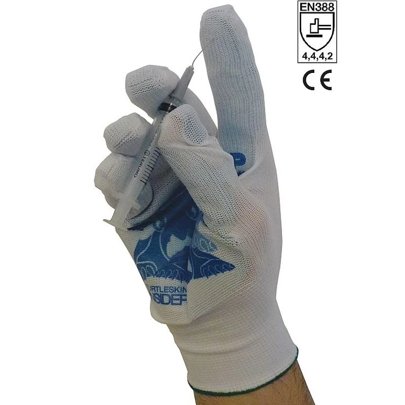 Turtleskin use a 28 Gauge needle to test the resistance of their glove range. The needle is aimed at the glove at a 90 degree angle, at a velocity of 500mm/min. This is repeated 12 times and the average force required to puncture the glove is then recorded.